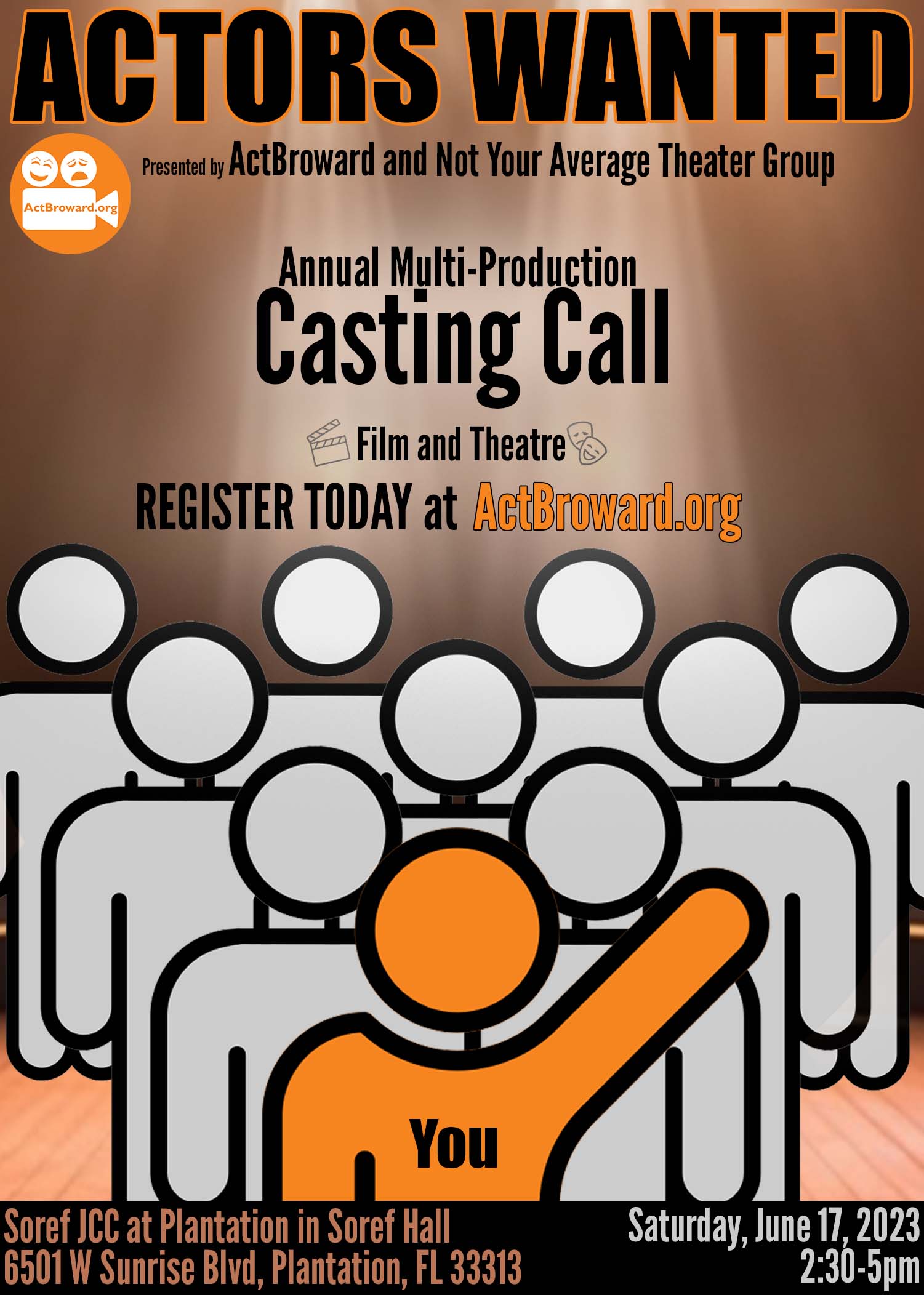 Join Not Your Average Theater Group and ActBroward for their collaborative Annual Multi-Production Casting Call on June 17, 2023, from 2:30 PM - 5:00 PM at the Soref JCC at Plantation, 6501 W Sunrise Blvd, Plantation, FL 33313.